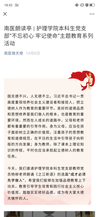 今天,我们邀请时搏(中国)本科生党支部教师党员杨柳老师朗诵《之江新语》的选篇“成才必须先学做人”,希望我们能够在加强品德教育上下功夫,教育引导学生培育和践行社会主义核心价值观,踏踏实实修好品德,成为有大爱大德大情怀的人。